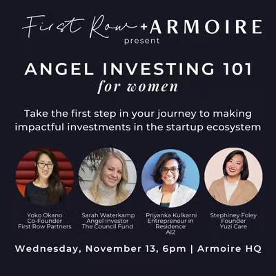 First Row Partners partnered with Armoire to host an evening dedicated to demystifying angel investing. Yoko moderated a discussion with panelists Sarah Waterkamp (angel investor), Priyanka Kulkarni (entrepreneur in residence at AI2), and Stephiney Foley (angel investor and founder of Yuzi Care). They covered a variety of topics, from ways to engage in the startup ecosystem, to assessing ideas and founders before investing, to finding the "mode" that’s most meaningful to you. Guests also got a special behind-the-scenes tour of the Armoire space following the discussion.